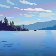 Hi there! I'm pleased you made it to my site. I am a digital painter in the Lakes Region of New Hampshire. I mostly create landscapes—or lakescapes as I call them since the preponderance of my drawings are of lake scenes. I live on a lake and am continually struck by its beauty and variety. I attempt to convey the feeling of looking out across the water (or mountains, or forest). Depth and space are created through the layering of color of varying opacity. I have a graphic design background—I was in advertising design for 20 years before teaching digital art in high school for 20 years—so my drawings are informed by a graphic sensibility—bold, simple shapes and colors, concern for the impression of a piece.